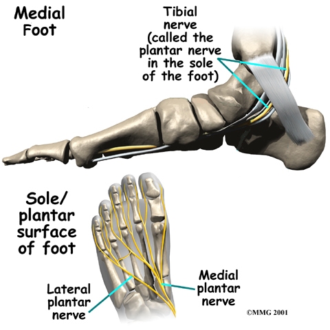 The main nerve to the foot, the tibial nerve, enters the sole of the foot by running behind the inside bump on the ankle, the medial malleolus.