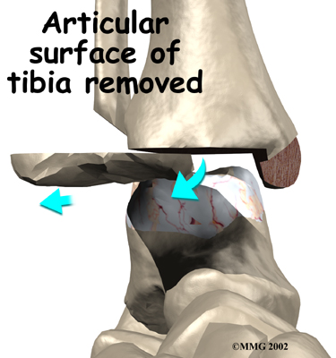 Several different operations have been developed to perform an ankle fusion. The basic procedure in each operation remains the same, however. The most common way that an ankle fusion is done is by making an incision through the skin to open the joint. Once the joint is opened, the surgeon uses a surgical saw to remove the articular cartilage surfaces of the ankle joint. Once the articular cartilage is removed on both sides of the joint, the body will try to heal the two surfaces together just as if it were fractured or broken.