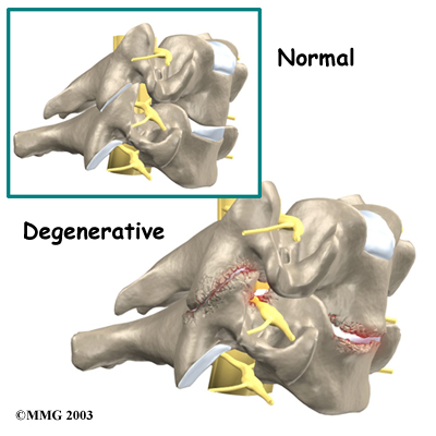 Soft tissue around the facet joint can be injured. Many of the pain-sensing nerves of the spine are in the facet joints. The normally smooth surfaces on which these joints glide can become rough, irritated, and inflamed. Studies show that neck pain often comes from the damaged facet joints.