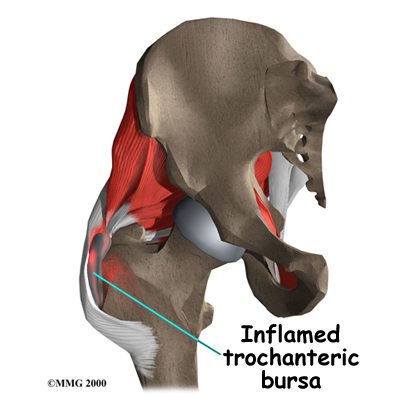 A common spot for bursitis is on the side of the hip. Here a large tendon passes over the bony bump on the side of the hip. The bony bump is called the greater trochanter. Inflammation in the bursa between the tendon and the greater trochanter is called trochanteric bursitis. This problem is common in older individuals. It may also occur in younger patients who are extremely active in exercises such as walking, running, or biking.