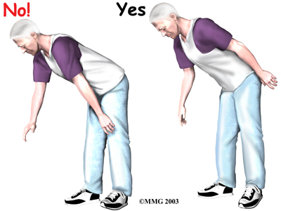 - Don't bend over past ninety degrees at the waist. Your hip may go past ninety degrees if you bend over at the waist to tie your shoes or pick up items off the floor.