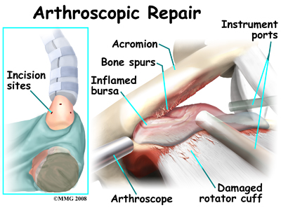 To perform the acromioplasty using the arthroscope, several small incisions are made to insert the arthroscope and special instruments needed to complete the procedure. These incisions are small, usually about one-quarter inch long. It may be necessary to make three or four incisions around the shoulder to allow the arthroscope to be moved to different locations to see different areas of the shoulder.