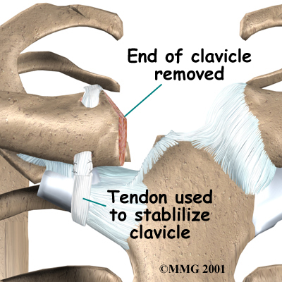 The most common procedure for SC joint osteoarthritis is resection arthroplasty. A resection arthroplasty involves removing the surface of the clavicle next to the sternum. This keeps the arthritic bone surfaces from rubbing on one another. The remaining end of the clavicle eventually attaches to the rib with scar tissue. This stops the end of the clavicle from moving around when you move your arm.