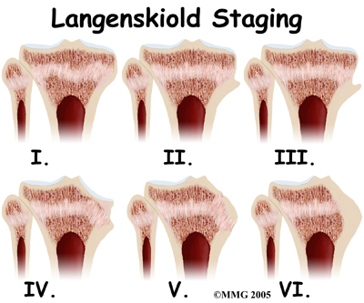 Bowing of the bones can be seen more clearly on X-rays. There are six stages of tibia varum seen on X-ray and named after the physician (Dr. Langenskiold) who first described them. The radiologist will see a sharp varus angle and other changes in the metaphysis. Often there is widening of the growth plate. The top of the tibia looks like it has grown a beak just on the medial side.