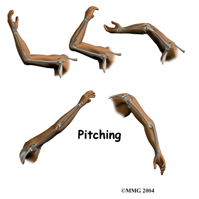 For example, pitching can lead to an overuse strain and, in turn, cause elbow OCD. Throwing puts a lot of force on the elbow joint, and when this action is repeated frequently, it can damage the immature joint surface of an adolescent's elbow. After winding up and bending the arm back, the pitcher must quickly accelerate the arm to gain ball speed. However, the pitcher also has to almost immediately slow the arm down and follow through with the throw. In addition, the pitcher may angle the elbow outward slightly during the acceleration phase to get more ball speed. This action wedges the head of the radius against the capitellum. Furthermore, as the pitcher slows the arm down during the follow-through after a pitch, the forearm is fully pronated. This action puts extra pressure on the humeroradial joint.