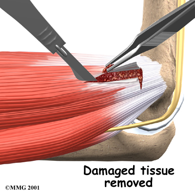 The flexor tendon is then cut where it connects to the medial epicondyle. The surgeon splits the tendon and takes out any extra scar tissue. Any bone spurs found on the medial epicondyle are removed. (Bone spurs are pointed bumps that can grow on the surface of the bones.) Some surgeons suture the loose end of the tendon to the nearby fascia tissue. (Fascia tissue covers the muscles and organs throughout your body.)
