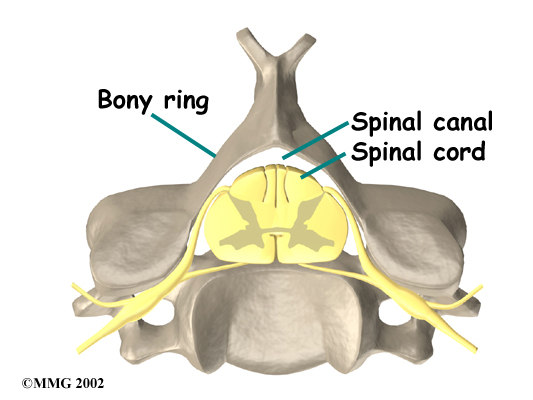 The spine is made of a column of bones. Each bone, or vertebra, is formed by a round block of bone, called a vertebral body. A bony ring attaches to the back of the vertebral body. When the vertebra bones are stacked on top of each other, the bony rings forms a long bony tube that surrounds and protects the spinal cord as it passes through the spine.