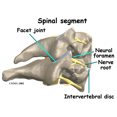 Each spinal segment includes two vertebrae separated by an intervertebral disc, the nerves that leave the spinal cord at that level, and the small facet joints that link each level of the spinal column.
