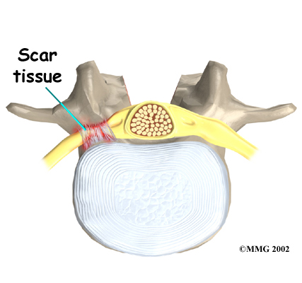 Any surgery that is done near the spinal canal can potentially cause injury to the spinal cord or spinal nerves. Injury can occur from bumping or cutting the nerve tissue with a surgical instrument, from swelling around the nerve, or from the formation of scar tissue. An injury to the spinal cord or spinal nerves can cause muscle weakness and a loss of sensation to the areas supplied by the nerve.