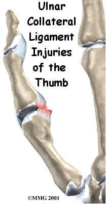 Injury to the ulnar collateral ligament of the thumb is fairly common. This strong band of tissue is attached to the middle joint of the thumb, the joint next to the web space of the thumb. This condition is sometimes called gamekeeper's thumb because Scottish gamekeepers commonly injured their thumbs as a result of their job.