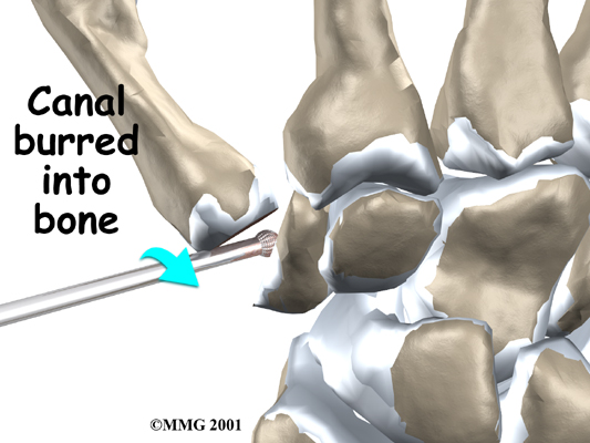 A burr is used to make a small notch, or canal, in the ends of the two bones. The surgeon shapes the notch so the ball-shaped implant will fit snugly in the joint. The implant is placed between the ends of the shaped bones.