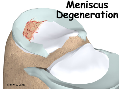 The tissue that forms the menisci weakens with age, making the menisci prone to degeneration and tearing. People of older ages often end up with a tear as result of a minor injury, such as from the up-and-down motion of squatting. Most often, there isn't one specific injury to the knee that leads to the degenerative type of meniscal tear. These tears of the menisci are commonly seen as a part of the overall condition of osteoarthritis of the knee in aging adults. Degenerative tears cause the menisci to fray and become torn in many directions.