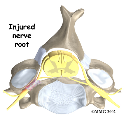 Any surgery that is done near the spinal canal can potentially cause injury to the spinal cord or spinal nerves. Injury can occur from bumping or cutting the nerve tissue with a surgical instrument, from swelling around the nerve, or from the formation of scar tissue. An injury to these structures can cause muscle weakness and a loss of sensation to the areas supplied by the nerve.
