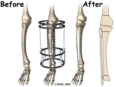 When the child has surgery with external fixators and distraction osteogenesis, gradual correction of the deformity takes place over the next three weeks. After the tibia is straightened, extra rods are used to stabilize the external frame. The frame is taken off about 12 weeks postoperatively.