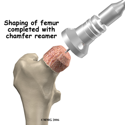 The hip socket may remain unchanged but more often it is replaced with a thin metal cup. A special tool called a reamer is used to remove the cartilage from the acetabulum and shape the socket to fit the acetabular component. Once the shape is correct, the acetabular component is pressed into place in the socket. Friction holds the metal liner in place until bone grows into the holes in the surface and attaches the metal to the bone.