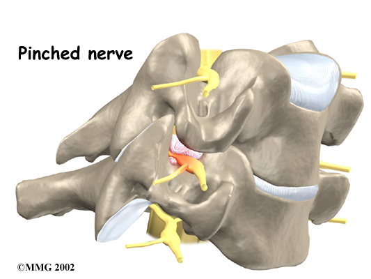 The intervertebral disc sits directly in front of the opening. A bulged or herniated disc can narrow the opening and put pressure on the nerve. A facet joint sits in back of the foramen. Bone spurs that form on the facet joint can project into the tunnel, narrowing the hole and pinching the nerve.