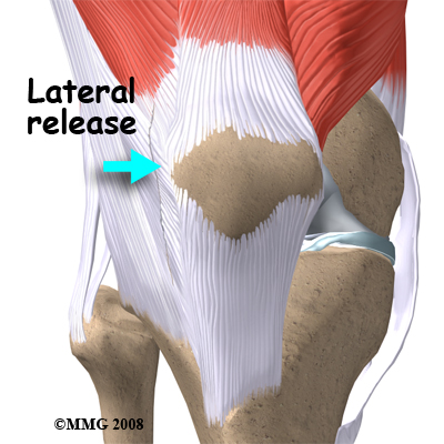 If your patella problems appear to be caused by a misalignment problem, a procedure called a lateral release may be suggested. This procedure is done to allow the patella to shift back to a more normal position and relieve pressure on the articular cartilage. In this operation, the tight ligaments on the outside (lateral side) of the patella are cut, or released, to allow the patella to slide more towards the center of the femoral groove. These ligaments eventually heal with scar tissue that fills in the gap created by the surgery, but they no longer pull the patella to the outside as strongly as prior to the surgery. This helps to balance the pull from the quadriceps muscles and equalize the pressure on the articular cartilage behind the patella.