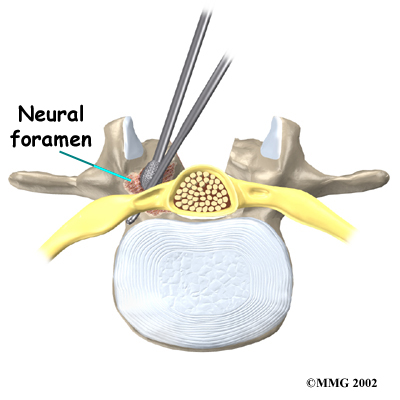 The surgeon may use small cutting instruments to carefully remove soft tissues near the spinal nerves. Then the surgeon takes out any disc fragments and scrapes off nearby bone spurs. In this way, the nerves inside the spinal canal are relieved of additional tension and pressure. The surgeon also enlarges the neural foramina, if needed. The neural foramina are the small openings between the vertebrae where the nerves travel out of the spinal canal.