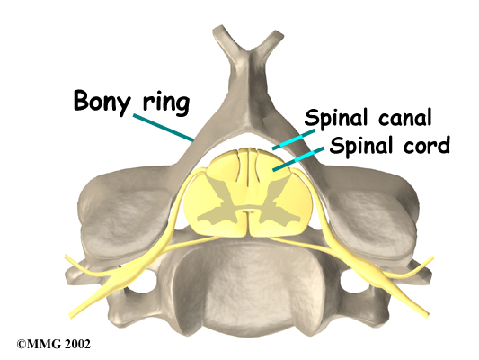 Each vertebra is formed by a round block of bone, called a vertebrae body. A bony ring attaches to the back of the vertebral body. When the vertebrae are stacked on top of each other, the rings form a hollow tube. This bony tube surrounds the spinal cord as it passes through the spine. Just as the skull protects the brain, the bones of the spinal column protect the spinal cord.