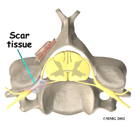 Any surgery that is done near the spinal canal can potentially cause injury to the spinal cord or spinal nerves. Injury can occur from bumping or cutting the nerve tissue with a surgical instrument, from swelling around the nerve, or from the formation of scar tissue. An injury to these structures can cause muscle weakness and a loss of sensation to the areas supplied by the nerve.