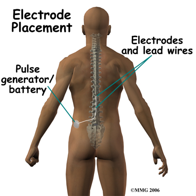 Spinal cord stimulation can be thought of as blocking the pain signal as it travels up the spinal cord to the brain. The small stimulator device is similar to a pacemaker and is implanted underneath the skin, usually in the lower abdomen or upper buttock. The device is connected to special electrodes that are positioned over the back of your spinal cord by wires placed inside the spinal canal. The stimulator device delivers an electrical current to the electrodes that interrupts the conduction of the pain signal, replacing the pain with a tingling, or buzzing sensation, which is often soothing. The electrical stimulation serves as a distraction and allows your brain to focus on the tingling rather than the painful pain signals.