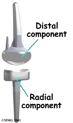 Modern artificial wrist joints are made of metal and plastic. The part that fits against the end of the radius bone of the forearm is called the radial component. It is made up of two pieces. A flat metal piece is placed on the front part of the radius. It has a stem that attaches down into the canal of the bone. A plastic cup fits onto the metal piece, forming a socket for the artificial wrist joint.