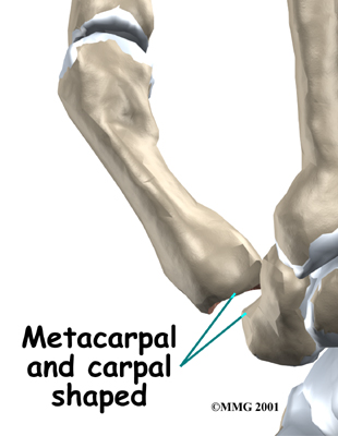 Several ligaments (bands of strong tissue) hold the bones of the joint together. These ligaments join to form the joint capsule of the CMC joint. The joint capsule is a watertight sac around the joint.