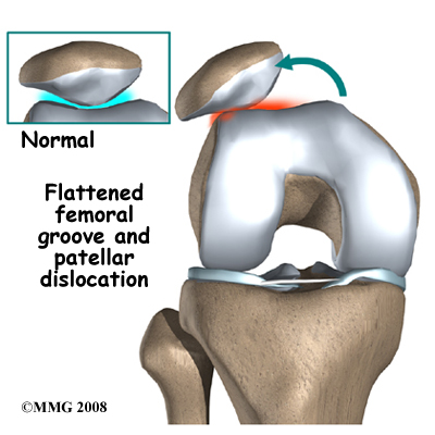 Anatomic variations in the bone shapes themselves can also occur which contribute to the development of chondromalacia patella. For instance, one side of the femoral groove can be smaller than the other. This creates a situation where the groove is too shallow, usually on the outside part of the knee. People who have a shallow groove sometimes have their patella slip sideways out of the groove, causing a patellar dislocation. This is not only painful when it occurs, but it can damage the articular cartilage underneath the patella. If this occurs repeatedly, degeneration of the patellofemoral joint occurs fairly rapidly.