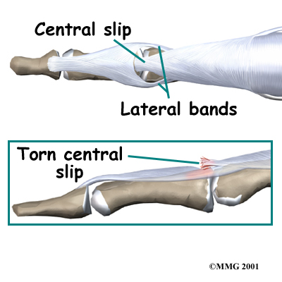 When a small amount of bone is pulled off with the tendon, doctors call it an avulsion fracture. The central slip can also be torn when the PIP joint is dislocated and the middle phalanx dislocates towards the palm.