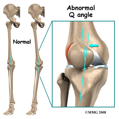 Another type of imbalance may occur due to differences in how the bones of the knee are angled. These differences, or anatomic variations, are something people are born with. The angle between the thighbone and the shinbone is referred to as the "Q angle". Some people are born with a greater than average Q angle. Women also tend to have a greater Q angle than men, due to their wider hips. The patella normally sits at the center of this angle within the femoral groove. When the quadriceps muscle contracts, the knee straightens, pushing the patella slightly to the outside of the knee. In cases where the Q angle is increased, the patella tends to shift outward with greater pressure. This leads to a similar pressure imbalance as when the VL is stronger than the VMO: As the patella slides through the groove, it places more pressure on outside edge of the patella, leading to damage of the underlying articular cartilage.