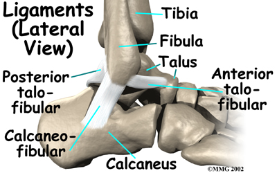 Ligaments are tough bands of tissue that help connect bones together. Three ligaments make up the lateral ligament complex on the side of the ankle farthest from the other ankle. They are the anterior talofibular ligament (ATFL), the calcaneofibular ligament (CFL), and the posterior talofibular ligament (PTFL). The common inversion injury to the ankle usually involves Two ligaments, the ATFL and CFL. Normally, the ATFL keeps the ankle from sliding forward, and the CFL keeps the ankle from rolling inward on its side.