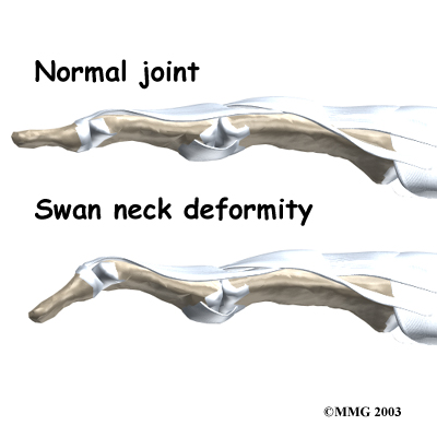 Conditions that loosen the PIP joint and allow it to hyperextend can produce a swan neck deformity of the finger. Rheumatoid arthritis (RA) is the most common disease affecting the PIP joint. Chronic inflammation of the PIP joint puts a stretch on the volar plate. (As mentioned earlier, the volar plate is a supportive ligament in front of the PIP joint that normally keeps the PIP joint from hyperextending.) As the volar plate becomes weakened and stretched, the PIP joint becomes loose and begins to easily bend back into hyperextension. The extensor tendon gets out of balance, which allows the DIP joint to get pulled downward into flexion. As the DIP joint flexes and the PIP joint hyperextends, the swan neck deformity occurs.