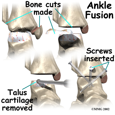 When the ankle joint becomes so painful that it is difficult to walk, surgery may be suggested to fuse the ankle joint. An ankle fusion is sometimes also called an ankle arthrodesis. In this operation, the three bones that make up the ankle joint (the talus, the tibia, and the fibula) are allowed to grow together, or fuse, into one bone. Once this is done the ankle no longer is able to move, but with a successful fusion the pain is gone. Most people with a successful fusion of the ankle are able to walk without much trouble, and in some cases it is almost impossible to tell that the ankle is stiff. But it is very difficult to run because you lose the ability to push off with the toes. The foot can't bend down.