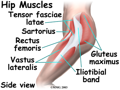 A long tendon band runs alongside the femur from the hip to the knee. This is the iliotibial band. It gives a connecting point for several hip muscles. A tight iliotibial band can cause hip and knee problems.