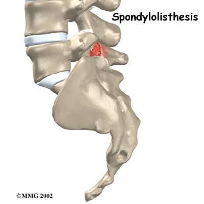 A condition called spondylolysis can lead to the slippage that happens with spondylolisthesis. Spondylolysis is a defect in the bony ring of the spinal column. It affects the pars interarticularis, mentioned earlier. This defect is most commonly thought to be a stress fracture that happens from repeated strains on the bony ring. Participants in gymnastics and football commonly suffer these strains. Spondylolysis can lead to the spine slippage when a fracture occurs on both sides of the bony ring. This slippage is called spondylolisthesis. The slippage is graded from I through IV, one being mild, IV often causing neurological symptoms. The back section of the bony ring separates from the main vertebral body, so the injured vertebra is no longer connected by bone to the one below it. In this situation, the facet joints can't provide their normal support. The vertebra on top is then free to slip forward over the one below.