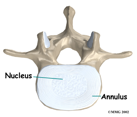 An intervertebral disc is made of two parts. The center, called the nucleus, is spongy. It provides most of the shock absorption in the spine. The nucleus is held in place by the annulus, a series of strong ligament rings surrounding it.