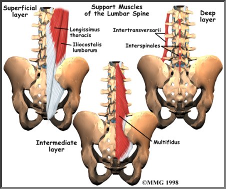 The muscles of the low back are arranged in layers. Those closest to the skin's surface, the superficial layer, are covered by a thick tissue called fascia. The middle layer, called the erector spinae, has strap-shaped muscles that run up and down over the lower ribs, chest, and low back. They join in the lumbar spine to form a thick tendon that binds the bones of the low back, pelvis, and sacrum. The deepest layer of muscles attaches along the back surface of the spine bones, connecting the low back, pelvis, and sacrum. These deepest muscles coordinate their actions with the muscles of the abdomen to help hold the spine steady during activity.