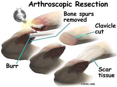 The most common procedure for AC joint osteoarthritis is resection arthroplasty. A resection arthroplasty involves removing a small portion of the end of the clavicle. This leaves a space between the acromion (the piece of the scapula that meets your shoulder) and the cut end of the clavicle, where the joint used to be. Your surgeon will take care not to remove too much of the end of the clavicle to prevent any damage to the ligaments holding the joint together. Usually only a small portion is removed, less than one cm (about three-eighths of an inch). As your body heals, the joint is replaced by scar tissue. Remember, the AC joint doesn't move much, but it does need to be flexible. The scar tissue allows movement but stops the bone ends from rubbing together.