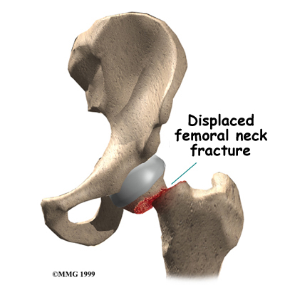 This test is done to be certain there is no fracture before allowing the patient to put weight on the leg. Walking on a fractured hip may cause the two sides of the fracture to displace, or move apart, so that they no longer line up correctly. A fracture that has not displaced is much easier to treat than one that has. A displaced fracture also increases the risk of damaging the blood supply to the femoral head, causing AVN (discussed earlier).