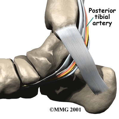 The main blood supply to the foot, the posterior tibial artery, runs right beside the nerve of the same name. Other less important arteries enter the foot from other directions.
