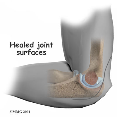 After surgery, your elbow will be bandaged and supported by a movable splint. The splint holds the surfaces of the joint apart slightly as they heal. Your surgeon will want to check your elbow within five to seven days. Stitches will be removed after 10 to 14 days, though most of them will have been absorbed into your body. You may have some discomfort after surgery. Your surgeon can give you pain medicine to control the discomfort.