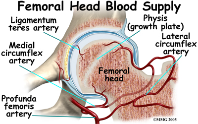 The blood vessels that go to the epiphysis run along the side of the femoral neck and are in danger of being torn or pinched off if something happens to the growth plate. This can result in a loss of the blood supply to the epiphysis.