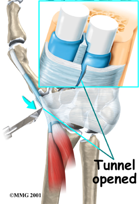The surgeon moves aside other tissues and locates the tendons and the tunnel. An incision is made to split the roof, or top, of the tunnel. This allows the tunnel to open up, creating more space for the tendons. The tunnel will eventually heal closed, but it will be larger than before. Scar tissue will fill the gap where the tunnel was cut.