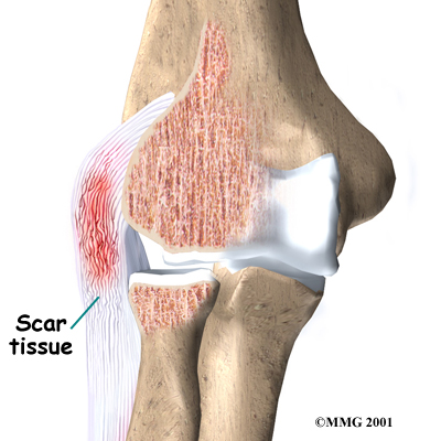 The extensor tendon is then cut where it connects to the lateral epicondyle. The surgeon splits the tendon and takes out any extra scar tissue. Any bone spurs found on the lateral epicondyle are removed. (Bone spurs are pointed bumps that can grow on the surface of the bones.) Some surgeons suture the loose end of the tendon to the nearby fascia tissue. (Fascia tissue covers the muscles and organs throughout your body.) The skin is then stitched together.