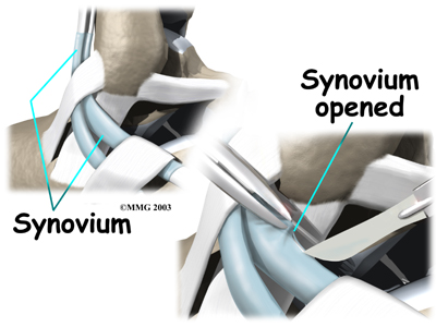When the lining of the tendon is painful and inflamed (as in tenosynovitis), the goal of surgery is to remove the irritated tissue from around the tendon. This operation is called tendon release. This procedure is done by carefully dividing the tendon sheath that encloses the tendon. Once the sheath is opened, the surgeon clears away the irritated tissues around the tendon. The sheath is not stitched back together. The gap in the sheath will eventually fill in with scar tissue. The skin is closed with sutures.