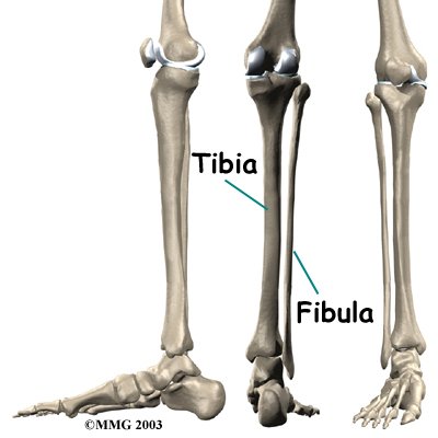 The lower leg is made up of two bones. The shinbone is the larger of the two bones. It is called the tibia. The small, thin bone that runs alongside the tibia from the knee to the ankle is the fibula.