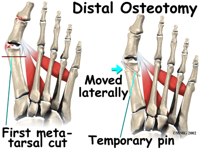 In some cases, the far end of the bone is cut and moved laterally (called a distal osteotomy). This effectively reduces the angle between the first and second metatarsal bones. This type of procedure usually requires one or two small incisions in the foot. Once the surgeon is satisfied with the position of the bones, the osteotomy is held in the desired position with one, or several, metal pins. Once the bone heals, the pins are removed. Removing of the pins usually occurs between three and six weeks following surgery.