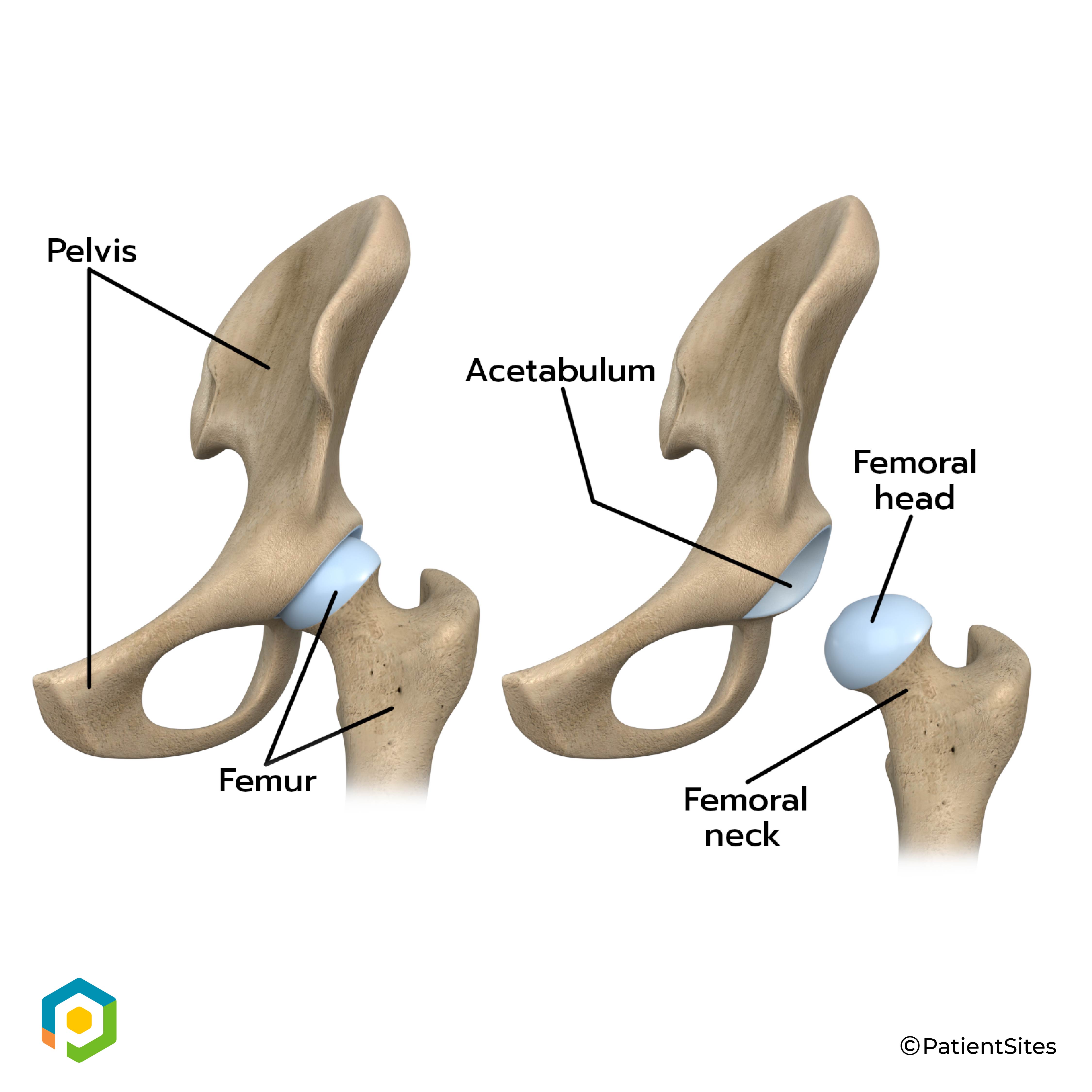 The hip socket is called the acetabulum and forms a deep cup that surrounds the ball of the upper thighbone, called the femoral head. The ball and socket is surrounded by a soft-tissue enclosure called the joint capsule.
