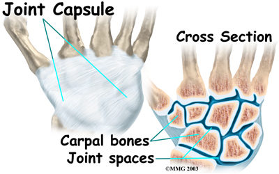 A joint capsule is a watertight sac that surrounds a joint and contains lubricating fluid called synovial fluid. In the wrist, the eight carpal bones are surrounded and supported by a joint capsule.