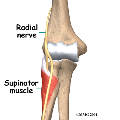 Passing through the radial tunnel, the radial nerve runs below the supinator muscle. The supinator muscle lets you twist your right hand clockwise. This is the motion of using a screwdriver to tighten a screw.